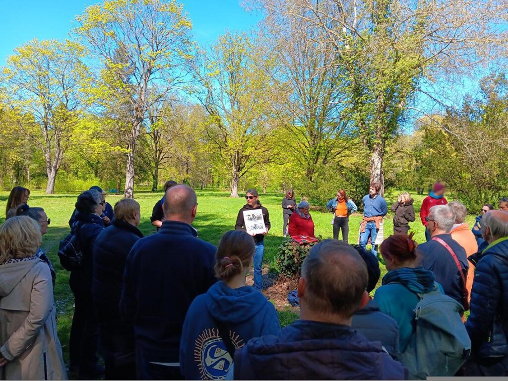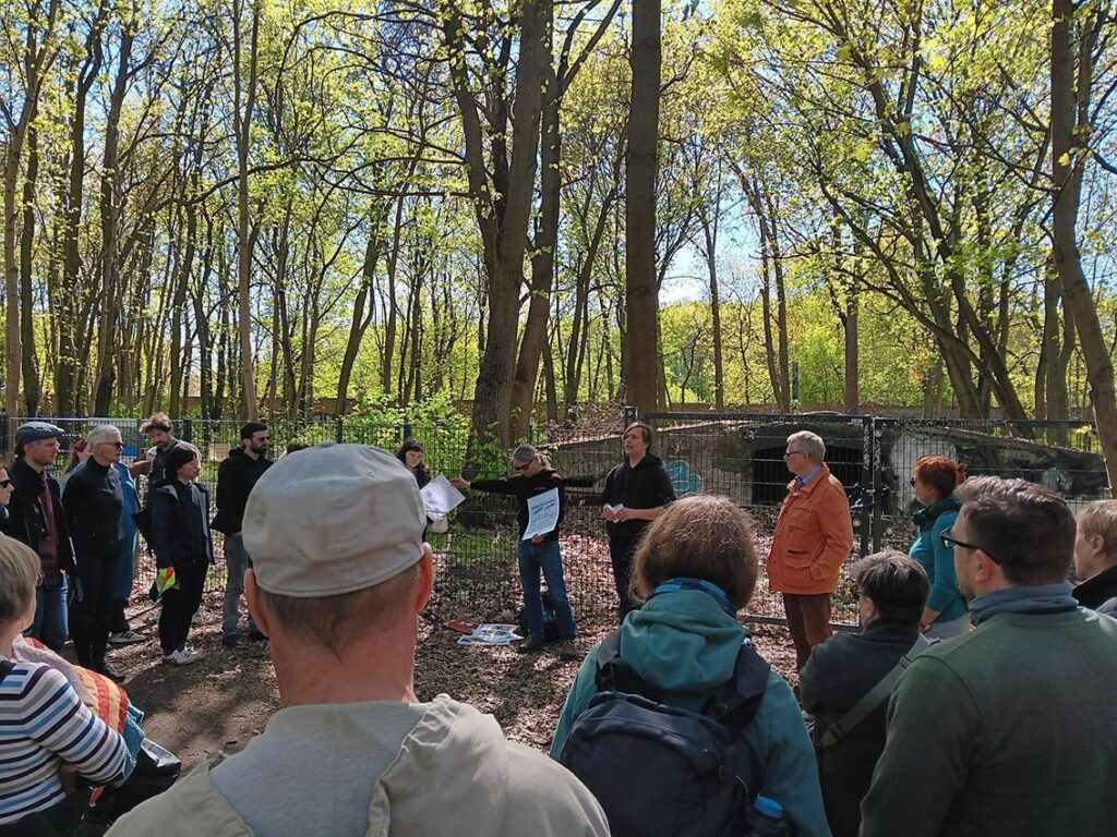 In den zweieinhalb Stunden Rundgang gab es Referate zur Vorgeschichte der Heide, das Bolle-Lied wurde angestimmt, zum Vergnügungspark, zum Zwangsarbeitslager, zur Kriegsgräberstätte und dem Sowjetischen Ehrenmal. Es folgten viele interessierte Nachfragen.
